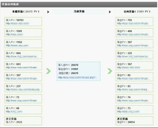 訪客經(jīng)常在網(wǎng)站中的各個(gè)頁(yè)面之間跳轉(zhuǎn),訪問(wèn)的路徑不勝枚舉,但可以通過(guò)觀察焦點(diǎn)頁(yè)面及其上下游頁(yè)面,掌握訪客的來(lái)路和去向,發(fā)現(xiàn)較普遍的訪客訪問(wèn)習(xí)慣。頁(yè)面訪問(wèn)軌跡即用來(lái)完成該功能,用戶可自由指定觀察焦點(diǎn)頁(yè)面,系統(tǒng)會(huì)列出該頁(yè)面的前十位來(lái)路頁(yè)面和去向頁(yè)面。對(duì)觀察焦點(diǎn)頁(yè)面而言,其自身的導(dǎo)入、導(dǎo)出PV的多少能夠反映出該頁(yè)面在網(wǎng)站的權(quán)重地位,而通過(guò)觀察來(lái)源和去向頁(yè)面又能最大限度的了解到訪客的行為習(xí)慣及興趣點(diǎn)。