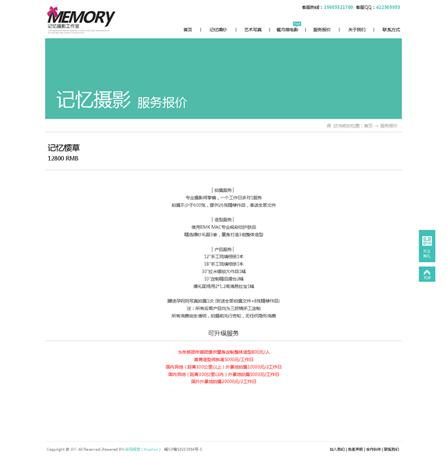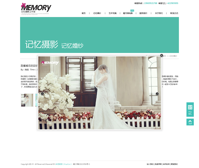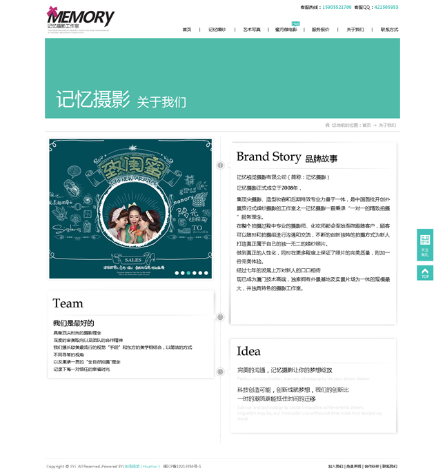 記憶視覺攝影有限公司(簡稱:記憶攝影)記憶攝影正式成立于2008年,集頂尖攝影、造型妝容和后期特效專業(yè)力量于一體,是中國首批開創(chuàng)外景旅行式婚紗攝影的工作室之一記憶攝影一直秉承“一對一的精致拍攝”服務(wù)理念。在整個拍攝過程中專業(yè)的攝影師、化妝師都會至始至終跟隨客戶,顧客可以隨時和拍攝組進(jìn)行溝通和交流,不斷的創(chuàng)新獨特的拍攝方式為新人打造真正屬于自己的獨一無二的婚紗照片。做到真正的人性化,同時在更多程度上保證了照片的完美質(zhì)量,附加一份完美體驗。